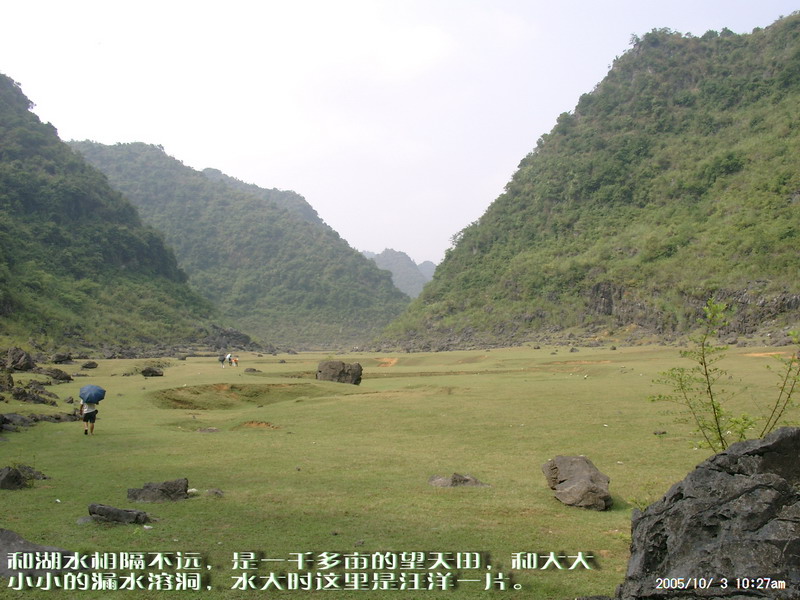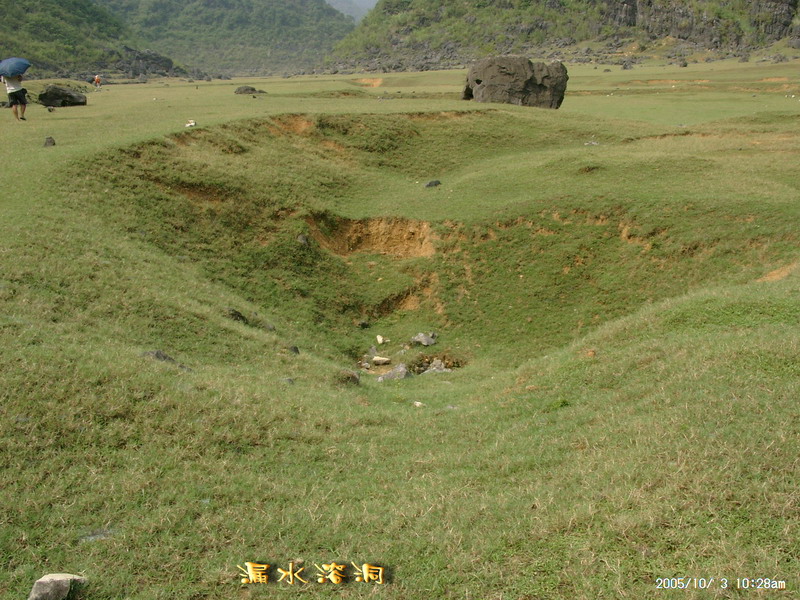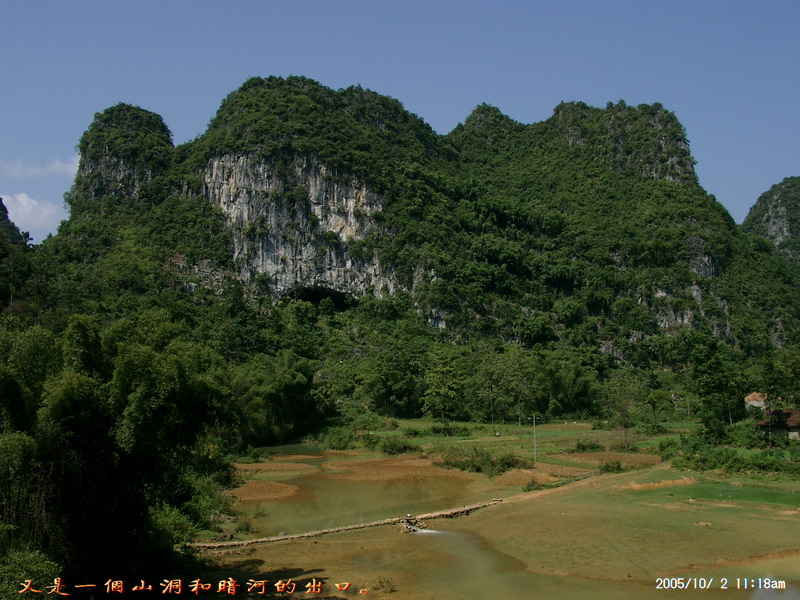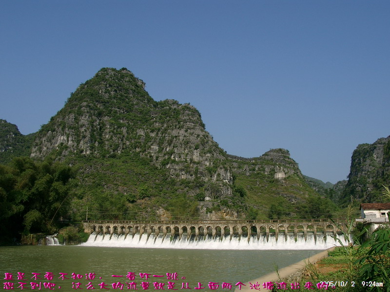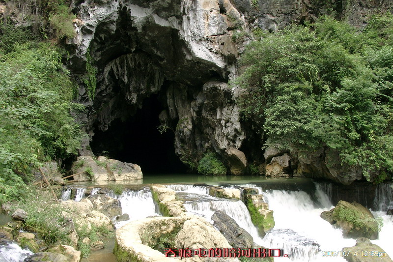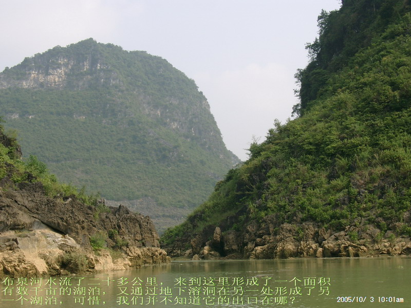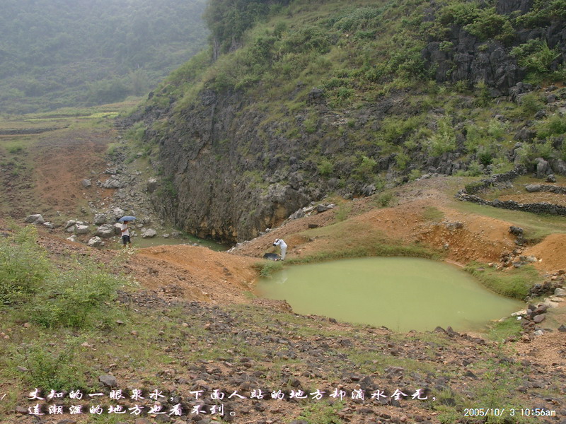 二号早上开始对水流量很大的布泉河寻渊觅源,布泉乡的东、北、西这三个方向方圆数十公里都没有任何水源。因此当我们来到据说是布泉河的源头时,仍然感到困惑,这只是一池几乎平静如镜的水塘,面积顶多也只有十来亩,一点点缓缓的流水经一个小小的溶洞从一座石山底下流淌到用作发电站的所谓“蓄水池”,这点流量和电站水坝流出的流量相比简直不可同日而语。我推测,在这宁静水塘的下面,肯定还有一股非常大的潜流作补充。 布泉河的源头在水清的时候可以看到泉水涌出的情景,可惜因为达维的影响,我们去的时候水有些混浊,看不到这一景观。