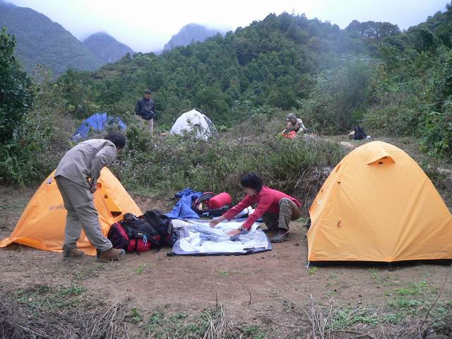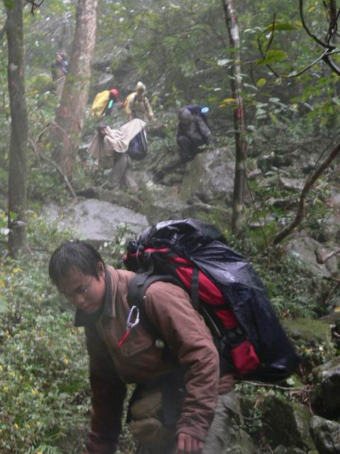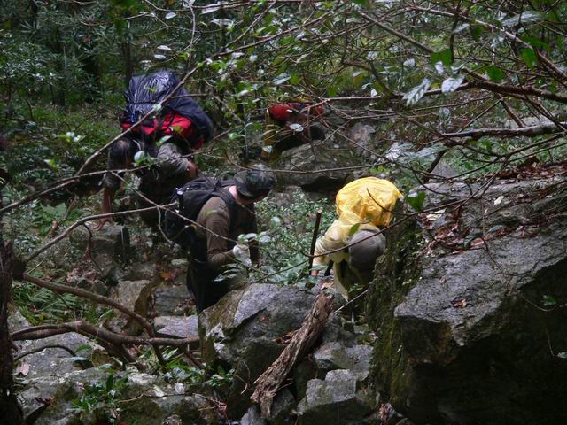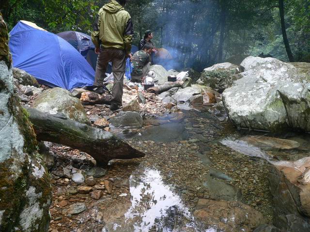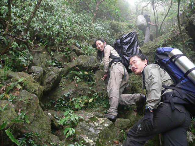 呵呵~ 10点40分,我们出发了, 我挺着饱饱的肚子,背着重重的包,又开始爬着石头走了~ 今天的天气好多了,隐约有点太阳,呵呵~ 我们的目标! 下水源村! 我们走啊走啊 走啊~ 一路上拍了不少的照片~ 留念啊~ 石头还是很滑,我的鞋子先是左边湿,然后一会儿也是右边湿,我真羡慕笨驴,一双北京凉鞋,在水里潇洒的走着,北京凉鞋真是好啊!还有他们穿解放鞋的,一样在水里走着,我看了我脚下的徒步鞋,前天刚买的耶~ 心痛点,还是不走水了,老老实实走石头~ 转眼,我由前面第4名变成了后面第4名,有点想埋地雷了,所以走慢点,等后面3个走在我前面我就埋雷,不然等下他们踩中怎么办?可惜,后面的3位仁兄一点都不争气,等了他们半天,他们还没有追上的,我站在原地又等了5分钟,终于他们上来了~ 我心里暗自高兴,可以埋雷了,就在这个时候! “虫!他们上来了没啊?快点啊!!!”180在前面叫到我! 昏~~~ 他怎么离我那么近啊?郁闷!! 走先了! 我大步向180走去! 他和南飞雁在前面的石头休息,“等你15分钟了,那么慢啊?”180说。我笑了笑说“等 后面的!”我们3个人继续走着,走着~ 走着~ 过了一下,我们走到将军他们那了,我们继续一起走,没有走多久,将军和色狼又拉开和我们的距离,我们后面是笨驴,离我们有80米了~ 时间已经是下午的1点30分了!我们的时间很紧很紧了!180作出定!“上山!走山路!!” 因为时间问题吧! 只好不走水路了! 我们上山了! 笨驴还在后面,因为他和他朋友都走过下水源,应该没有什么问题的! 我们前面6人走山路上山,翻山,下山!前面两个强人:将军和色狼 又走在我门的前面了,我,180,南飞雁,YY自己走着,走山路好痛苦,又上又下的,我的鞋子还没有穿习惯!不舒服~ 我们翻了几座山,给我喘气呼呼的,走得太快了~ 终于,我们在一个山的转弯处看见远远的地方上林县城了!呵呵……还有很多座山才到哦~! 心里有点兴奋,可以说我们快成功了哦! 我们小小休息了一下,加快步伐,向前走去! 又翻了一座山,终于,我们看见了广西的布达拉宫,下水源村!一个村庄在大山里面,半山腰上,真的好漂亮! 我有点顶不住了,我要埋地雷了!180他们先走了,我爬上山林里,拿出工兵铲,挖了个坑,把地雷埋了进去……哈哈,我怎么那么环保啊????掌声鼓励一下! 我自己一个人走在山里的小路上,有点怕哦,前后没有人,有风声,我加快步伐,终于,花了5分钟走到了下水源村!他们5个人在那里休息了!呵呵,180在那开锅了,煮面条!我们在那聊天着,将军和色狼已经到了30分钟了~ 我拿碗盖吃了一点点面条,在吃了一块干粮,喝了半瓶山水。肚子涨了。色狼还要泡快点河粉~ 呵呵~ 今天上午吃那么饱怎么现在又饿了啊? 我们在那休息了1个小时。笨驴还没有出现,我们打他的电话,关机了~ 昏! 怎么搞的嘛!