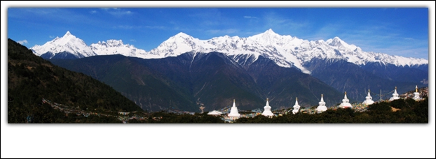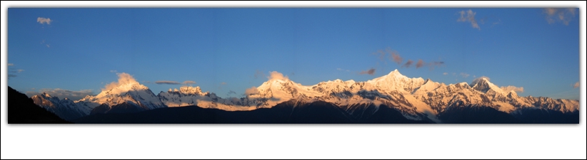 [原创]神山·阳光——朝觐梅里之行 六个多小时的车程,终于来到飞来寺的梅里雪山观景点,与在白马雪山的迎宾台看到的一样,梅里雪山遮在厚厚的云层当中,大群的游人等在山下,期待一睹神山的真容,也许是为人们的诚心所打动,卡瓦博格稍稍的露出一小点,但其他的山峰依然是躲在云雾里面。 5月2日,来到飞来寺的第一个早晨,六点一过就赶紧爬起,观景台已经是人头攒动,长枪短跑都已经摆好架势等待神山赏脸一露真容。 高原的早晨,天高无云,蓝天下神山静静的展现在人们的面前,卡瓦博格高大,他的右边,是秀丽挺拔的缅茨姆和神奇的五方佛,而左边,十六尊者则忠心地护卫者卡瓦博格这个雪山之神。随着天空的逐渐放亮,白色的雪山更显圣洁,卡瓦博格下的明永冰川也在阳光的照射下透出晶莹的蓝色。 朝觐梅里,是许多人的愿望,但能睹神山真容,还得有点运气,噼啪的快门声中,听到有人激动的说,已经来了四次,这次虽然没能看到日照金山的神奇景象,但神山这么清晰的展现面前,也算一圆一睹神山的梦想。而对于我来说,第一次来到山下,就能蒙神山赏脸,也只能感叹是运气忒好。