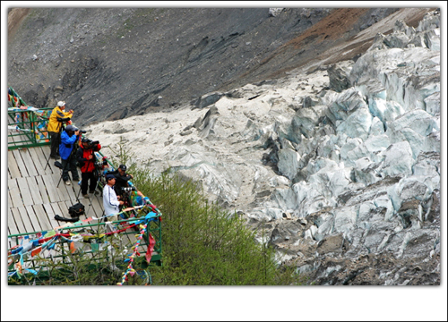 在海拔3300多米的观景台上和山包上,神山基本是与人平行的感觉,要感觉神山的高大,就要到神山脚下的明永冰川,仰望与亲近。 明永冰川是世界上稀有的低纬度低海拔季风海洋性气候冰川,远望冰川,在阳光的照射下,是晶莹的蓝色,而到了冰川面前,才发现,远望与近观,差别那是相当的大。 从观景台乘车往海拔2470米的明永村,海拔差不多下降了1000米,公路两旁都是褐色的山壁,澜沧江在山下静静的流淌,靠近雪山的原因,空气也显得清新、冰爽,雪山下的植物也明显比观景台的油绿,也许是吸收了神山灵气的缘故吧。