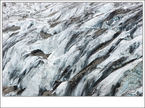 靠近冰川仰望神山,可以选择徒步或骑马,我们选择了徒步,从明永村开始徒步爬行,山道两旁长满了紫蓝色的兰花,马粪的气味不时混着粉尘窜入鼻间,随着海拔的不断上升,植物也慢慢变成高大挺拔的黄杉,由于大多是顺着3、40度的坡度上升,呼吸也开始变得困难,挪个10多米,就得停下喘口气。 转过两个呢嘛堆,终于来到冰川旁的观景栈道,这里,腕上的SUUNTO显示海拔3100米,而时间用了两小时四十分钟。 近观冰川,最底层的冰面上布满了黑色的砂砾,一道道裂缝中透出晶莹的蓝色,波浪的起伏告诉人们冰川还在往下流动,往上,是一座一座纯白的冰塔,密密麻麻的挤在一起,而冰川的顶上,就是海拔6740米的卡瓦博格。
