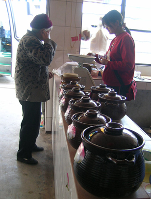 穿过迎晖门,沿步行街前行一公里后右拐,顺着一条被新老房子夹杂着的小道走二公里,我便来到了龙井市场.据攻略记载:龙井为建水城内一甜水井,建于明代洪武年间,相传为浙江籍移民所建,因其水质、水味与浙江杭州龙井寺中的龙井之水相似,因而赋“龙井”之名。现今建水县最大的农贸易市场建于此,故以此井定名为:“龙井农贸市场”。可问遍了整个市场的摊主,硬是没人知道龙井在哪.好不容易逮着了个当地的老人,他告诉我因为城建的需要,龙井早就给填埋了. 我心灰意冷地出了农贸市场.朝迎晖门走去,打算去另一方向寻找大板井.经过一单位小门口时,看到几个老人坐着聊天,便顺口问了句:大娘,知道龙井在哪吗.大娘朝门里指:在里面呀。原来龙井没有被填埋,真的很庆幸自己多嘴问了句,要不就与龙井擦肩而过。 我依着大娘的指引走入大院,来到一个上了锁的小门前,一位大姐走上来:小妹,想看井呀。 是呀.我回答. 大姐给我开了门,让我大为惊讶的是出现在我面前的是一口四眼井.真真想不到龙井居然是个四眼井