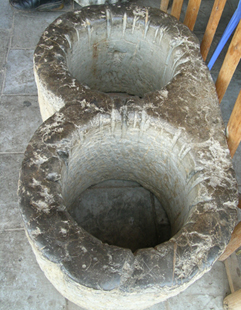 这是一口形如人双眼的井栏,但亦如已失明人的双眼,已没有了神采。 我是在迎晖门的城上看到这双眼井栏的,而至于它原来隶属于哪口井,已不得而知了.只是从身边的老人嘴里得知由于城建的需要,井被填了,井栏便暂时落户于此,充当石凳.只能从井栏上那一道道经年累月被提水桶绳子磨出来的凹痕看出其往日的辉煌.