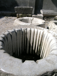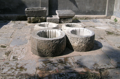 虽然在井边未发现打水的人,但从斑驳清亮的井台上可以看出,那是一口还未被人抛弃的井,而每口井栏边都有深达数寸的印痕,宽阔的井台四周全用石板砌得平平坦坦,旁边还有洗衣用的大石槽.大姐告诉我,每天清晨和傍晚,井边会挤满打水洗衣的人. 被打水绳勒得深达数寸的井栏