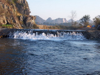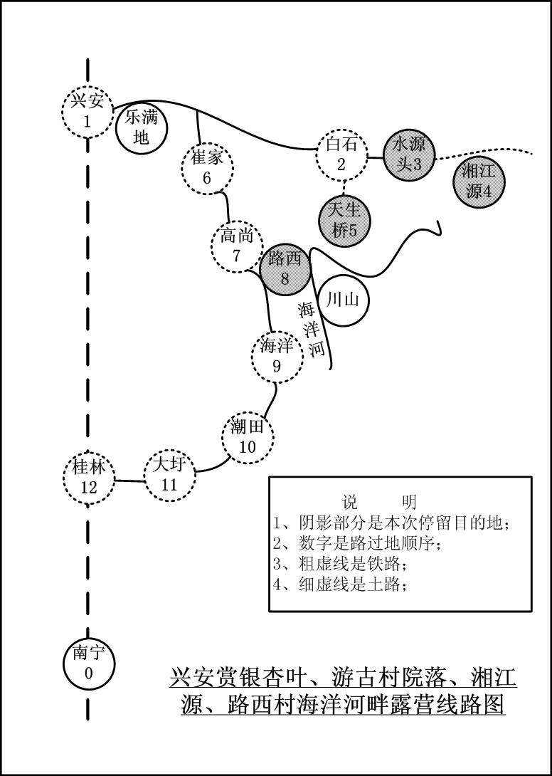 一、先报费用开销流水账(人/元)。 1、 南宁——兴安1628次普快36; 2、 兴安——白石乡水源头村包中巴车200/11; 3、 水源头村——白石乡包手扶拖拉机(嘻嘻…)15/11; 4、 水源头村餐费——夜茶(油茶、红薯、芋头)+早餐(油茶、米粥、水煮鸡蛋)+中餐(清水鸡、白果炖西洋鸭、豆腐、青菜、用金樱子(一种长于大石山的藤本植物的果实,具有清补健身作用)浸泡的农家米酒)+私下支付的导游陪护费=(15+35+165+20)/11; 5、 其中3人住农家15/3;其余因夜雨到建于宋代的秦家大院主宅厢房打地铺免费; 6、 白石乡包双排座汽车——天生桥地质溶洞群——兴安县高尚乡路西村120/8; 7、 周六晚,路西村自助晚餐——清水白果炖2只土鸡+萝卜(村主任月夜下带领我们到田里拔萝卜、葱花免费,哈哈)+自购猪肉+支付村民3斤米、炊具、柴盐叨扰酬谢=(57+0+7+20)/8; 8、 周日,路西村海洋江畔野炊即打即食土鱼+面条+(纯天然青菜+猪油+酸笋+盐+炊具免费)=(30+1.5)/8; 9、 路西村——桂林三里店中巴班车9(呵呵…痛苦啊,结算漏掉了这项了,大家要补交还给我哦。(全部费用开销经过另外2人审核,居然没审核出漏项来,真是不花自己的钱不心疼!哼哼…); 10、 桂林三里店——火车站公车1; 11、 桂林——南宁快速n803次车65; 12、 个人总费用181.4元(全程参加、并且无额外开销的情况)。预算200元。 二、引子。 上周三鱼鱼发过召集帖后,气象预告就一阵紧一阵地预告大风降温消息了,只听得我们心里发紧:该不会又要延期了吧……,果然,周四晚上开始降温,还伴随着冷雨,查气象预告说,周5除了桂林是多云转阴之外,全区包括附近云贵地区都是分散小雨,唯一安慰的消息是长沙(桂林冷空气的上游)小雨转阴,北风强劲5~6级。周5早上电话和水源头村联系问天气情况,说除了冷些,无雨。看着窗外一阵阵的冷雨,赶忙和鱼鱼商量这样的天气能出发吗?决定改期了。于是匆忙通知同伴们改期,不愿改期的就退回代购车费。及至上午11点左右,天气开始好转甚至太阳也出来了,心中大喜,立即再次和水源头村联系:还是无雨。遂又逐个征求同伴们的意见,除了菜青虫因为我们延期,已经“转会”到另一个项目外,大家十分踊跃表示:要去!于是赶紧购票,告知水源头村最后是12人,半夜1点半到达兴安,水源头村委副主任秦子富答应半夜随车来兴安接我们回村! 053.1 晚上6点过,许多同伴背着装备来了,6点20分,饵洞告知还在桃源饭店附近遭遇堵车,于是我们决定不等他了,赶忙退票,一伙人狂奔进站上车。 下午6点前后,天又下起了雨,一路上望着窗外的雨,我心里隐隐地感到担忧起来:兴安那边千万不要下雨哦…… 快到桂林时,小雨转变成了中雨,打在车窗上,也一滴一滴打在我的心里,凉凉的。车过桂林北站时,我欣喜地发现:站台上,铁道上,四野处处都是干干的——这里没下雨!同伴们看见了也很高兴。 半夜1点半,我们到达兴安,来到出站口,水源头村的秦子富已经在等候我们了:他个子不高,瘦瘦的,一双眼睛很大很明亮,带着付眼镜显得很精干。他说他下午送东西来兴安卖就没回去,一直在这里等我们,我握着他粗糙的手,心里感激他的热情和诚信负责的精神。大约10多分钟,他联系的中巴车来了,我们上车,朝着25km外的水源头村开去。快3点的时候,我们到达此行的第一站水源头村,不久天又开始下起了零星小雨。秦子富带领我们踏着石板路,穿过许多宽宽窄窄的小巷和转角,来到他家,热情地端出他妻子早已准备好的油茶、热乎乎的红薯、芋头请我们吃。经过将近8个小时旅途,天气很冷,大伙早已饥肠辘辘,品尝着热热的油茶、还有又软又甜的红薯,清香粉粉的芋头,不仅填饱了肚子,也温暖了大伙的身心。稍事休息,安排好3位同伴在他家客房休息,秦子富就带领我们去露营地。出到屋外,看到雨越来越密集了,他就建议我们住到建于宋代的秦家大院——秦家祠堂去。于是我们就随他来到秦家祠堂。黑夜里跟着他进了一扇门,又进一扇门,打开电灯,哇呈现在我们面前的是一个大房间干净宽敞地上堆着许多新开的木板,四周的墙是用木板新隔好的,古旧的柱子已经看不出材质了,房间里还连通着房间,大约有3~4间。女孩子们在里间,我们用木板铺在地上,上面铺防潮垫和睡袋,很快就入睡了,时间大约快凌晨4点了。黑暗里不知谁嘟哝了一句话:偶玩户外这么久,还第一次这么奢华的在木板上搭铺…… 006.1 三、千年古村落和秦家大院印象。 感觉没睡多久,就听见有人在窗外喊:朋友们起床了!快8点钟了!“唉唉,晕死了困死了,再睡一会吧”就又睡过去了。可潜意识有个声音在喊:起床吧,不是来睡觉的哦,去看银杏树和古村院落啊。惺忪着肿胀的眼皮起床收拾装备,不经意望见高高的古宅窗户外面透进鲜黄的银杏树影和黛蓝的远山,赶快打开街门,一股清新的空气裹着寒气涌进来,外面已经是阳光灿烂——天晴了! 008.1 来到户外,极目所见,到处是高宅大院,青石板整齐划一铺就的街巷,遇见的村民都友善地和你打招呼,不时听见雄鸡的鸣叫声……。 013.1 早餐的内容有油茶、红薯、芋头、白粥、鸡蛋; 早餐过后秦子富就带领我们到他家屋顶(在他的古屋边起了一栋二层楼的砖平房)观赏水源头村全景。 038.1、039.1、040 据他说,水源头村全姓秦,唐代(秦代?没记住)从山西搬迁过来的,到了宋代村里出了一个武状元,于是就修建了一座秦家祠堂,现存的祠堂就是宋代原建的古建筑,后来