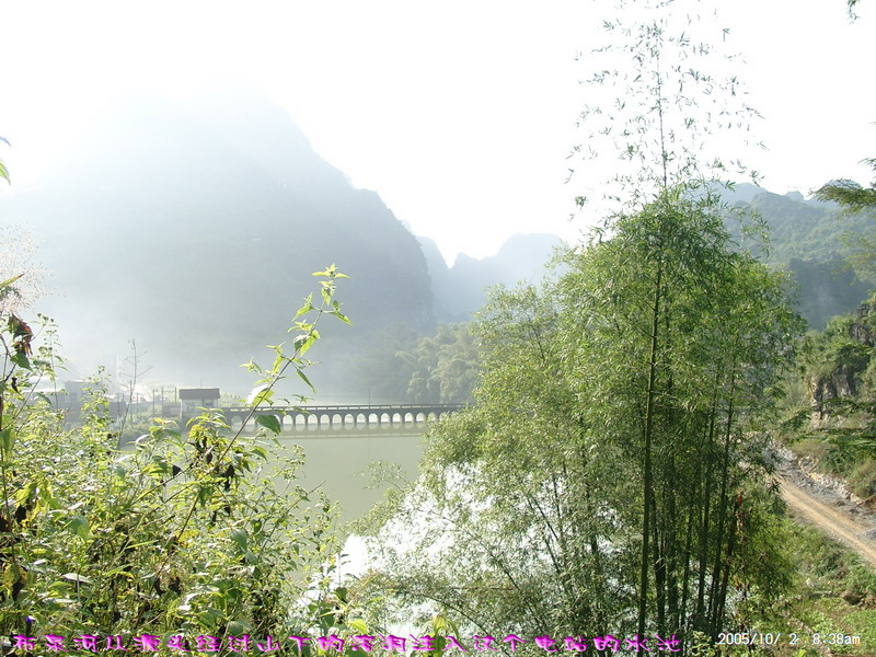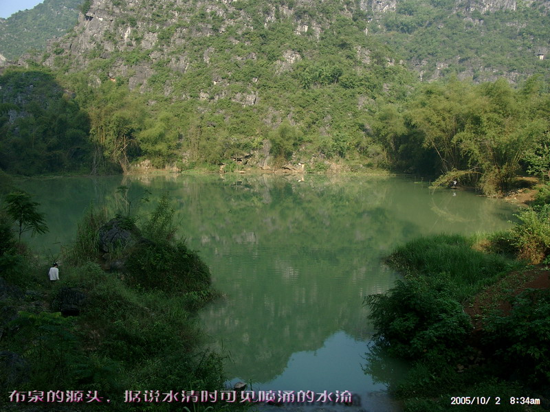 二号早上开始对水流量很大的布泉河寻渊觅源,布泉乡的东、北、西这三个方向方圆数十公里都没有任何水源。因此当我们来到据说是布泉河的源头时,仍然感到困惑,这只是一池几乎平静如镜的水塘,面积顶多也只有十来亩,一点点缓缓的流水经一个小小的溶洞从一座石山底下流淌到用作发电站的所谓“蓄水池”,这点流量和电站水坝流出的流量相比简直不可同日而语。我推测,在这宁静水塘的下面,肯定还有一股非常大的潜流作补充。 布泉河的源头在水清的时候可以看到泉水涌出的情景,可惜因为达维的影响,我们去的时候水有些混浊,看不到这一景观。