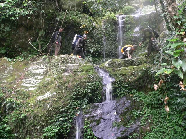 呵呵~ 10点40分,我们出发了, 我挺着饱饱的肚子,背着重重的包,又开始爬着石头走了~ 今天的天气好多了,隐约有点太阳,呵呵~ 我们的目标! 下水源村! 我们走啊走啊 走啊~ 一路上拍了不少的照片~ 留念啊~ 石头还是很滑,我的鞋子先是左边湿,然后一会儿也是右边湿,我真羡慕笨驴,一双北京凉鞋,在水里潇洒的走着,北京凉鞋真是好啊!还有他们穿解放鞋的,一样在水里走着,我看了我脚下的徒步鞋,前天刚买的耶~ 心痛点,还是不走水了,老老实实走石头~ 转眼,我由前面第4名变成了后面第4名,有点想埋地雷了,所以走慢点,等后面3个走在我前面我就埋雷,不然等下他们踩中怎么办?可惜,后面的3位仁兄一点都不争气,等了他们半天,他们还没有追上的,我站在原地又等了5分钟,终于他们上来了~ 我心里暗自高兴,可以埋雷了,就在这个时候! “虫!他们上来了没啊?快点啊!!!”180在前面叫到我! 昏~~~ 他怎么离我那么近啊?郁闷!! 走先了! 我大步向180走去! 他和南飞雁在前面的石头休息,“等你15分钟了,那么慢啊?”180说。我笑了笑说“等 后面的!”我们3个人继续走着,走着~ 走着~ 过了一下,我们走到将军他们那了,我们继续一起走,没有走多久,将军和色狼又拉开和我们的距离,我们后面是笨驴,离我们有80米了~ 时间已经是下午的1点30分了!我们的时间很紧很紧了!180作出定!“上山!走山路!!” 因为时间问题吧! 只好不走水路了! 我们上山了! 笨驴还在后面,因为他和他朋友都走过下水源,应该没有什么问题的! 我们前面6人走山路上山,翻山,下山!前面两个强人:将军和色狼 又走在我门的前面了,我,180,南飞雁,YY自己走着,走山路好痛苦,又上又下的,我的鞋子还没有穿习惯!不舒服~ 我们翻了几座山,给我喘气呼呼的,走得太快了~ 终于,我们在一个山的转弯处看见远远的地方上林县城了!呵呵……还有很多座山才到哦~! 心里有点兴奋,可以说我们快成功了哦! 我们小小休息了一下,加快步伐,向前走去! 又翻了一座山,终于,我们看见了广西的布达拉宫,下水源村!一个村庄在大山里面,半山腰上,真的好漂亮! 我有点顶不住了,我要埋地雷了!180他们先走了,我爬上山林里,拿出工兵铲,挖了个坑,把地雷埋了进去……哈哈,我怎么那么环保啊????掌声鼓励一下! 我自己一个人走在山里的小路上,有点怕哦,前后没有人,有风声,我加快步伐,终于,花了5分钟走到了下水源村!他们5个人在那里休息了!呵呵,180在那开锅了,煮面条!我们在那聊天着,将军和色狼已经到了30分钟了~ 我拿碗盖吃了一点点面条,在吃了一块干粮,喝了半瓶山水。肚子涨了。色狼还要泡快点河粉~ 呵呵~ 今天上午吃那么饱怎么现在又饿了啊? 我们在那休息了1个小时。笨驴还没有出现,我们打他的电话,关机了~ 昏! 怎么搞的嘛!
